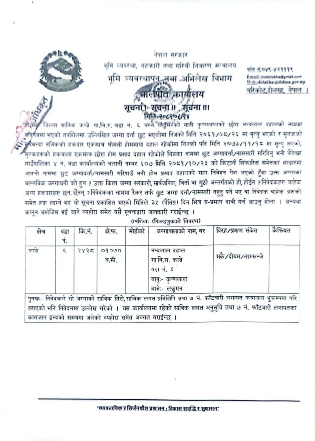 हकदावी सम्बन्धी ३५ दिने सार्वजनिक सूचना ।