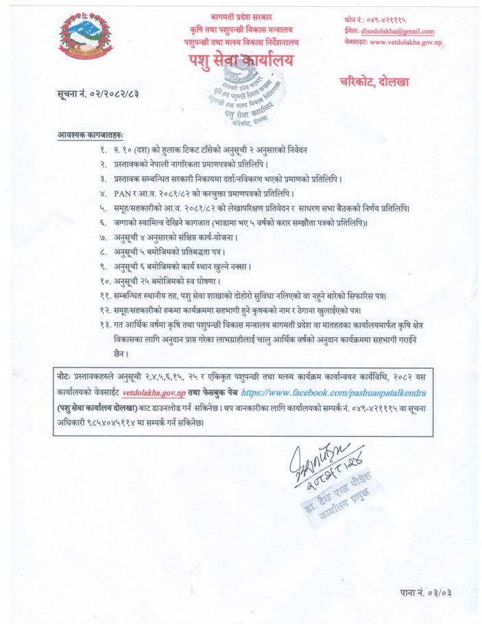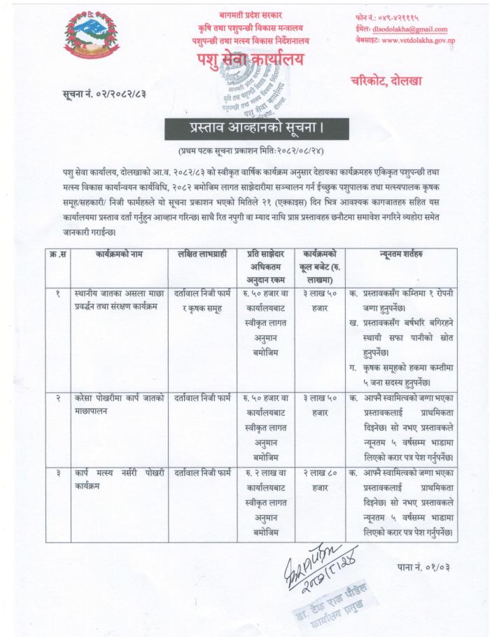प्रथम पटक सूचना प्रकाशित मितिः २०८२।०८।२४, पशु सेवा कार्यालय, दोलखा ।
