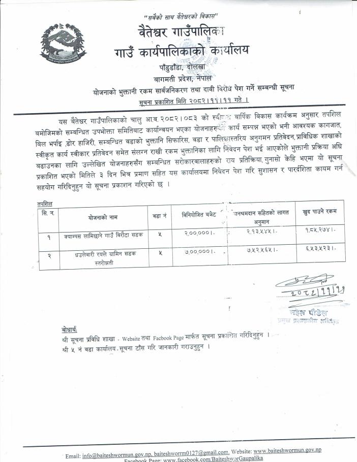 योजनाको भुक्तानी रकम सार्वजनिकरण तथा दाबी विरोध पेश गर्ने सम्बन्धी सूचना ।