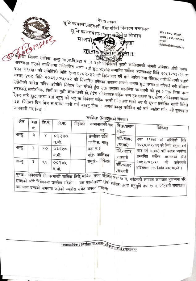 » छुट जग्गा दर्ता सम्बन्धी ३५ दिने सार्वजनिक सूचना ।
