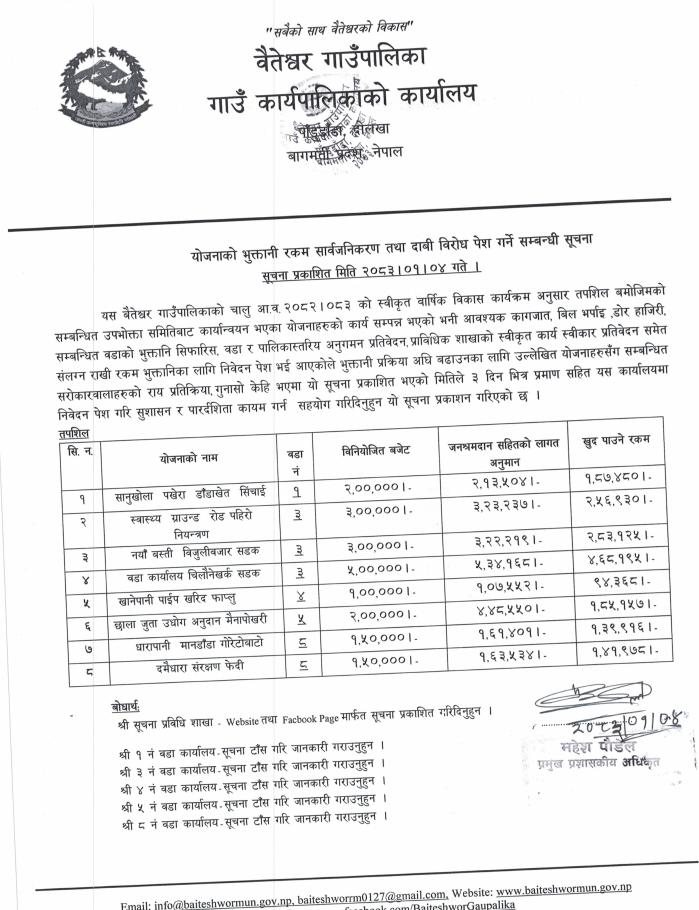 योजनाको भुक्तानी रकम सार्वजनिकरण तथा दाबी विरोध पेश गर्ने सम्बन्धी सूचना ।