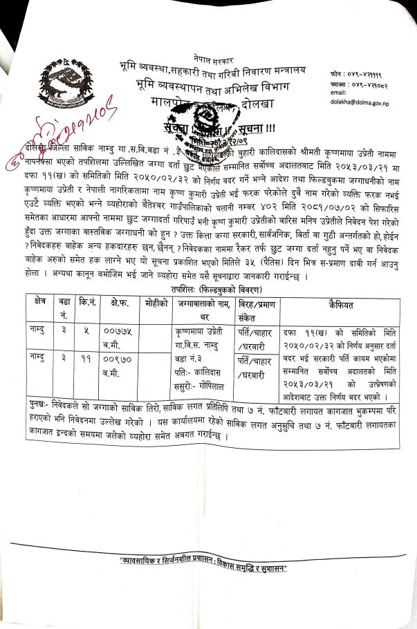» छुट जग्गा दर्ता सम्बन्धी ३५ दिने सार्वजनिक सूचना ।
