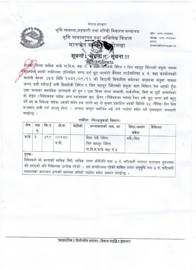 » छुट जग्गा दर्ता सम्बन्धी ३५ दिने सार्वजनिक सूचना ।