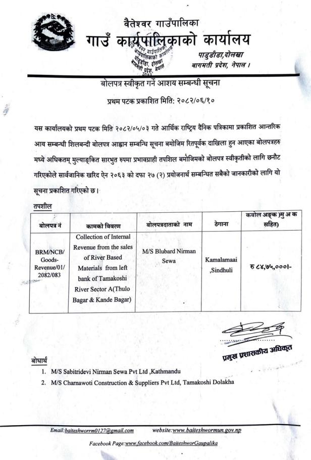 बोलपत्र स्वीकृत गर्ने आशय सम्बन्धी सूचना ।