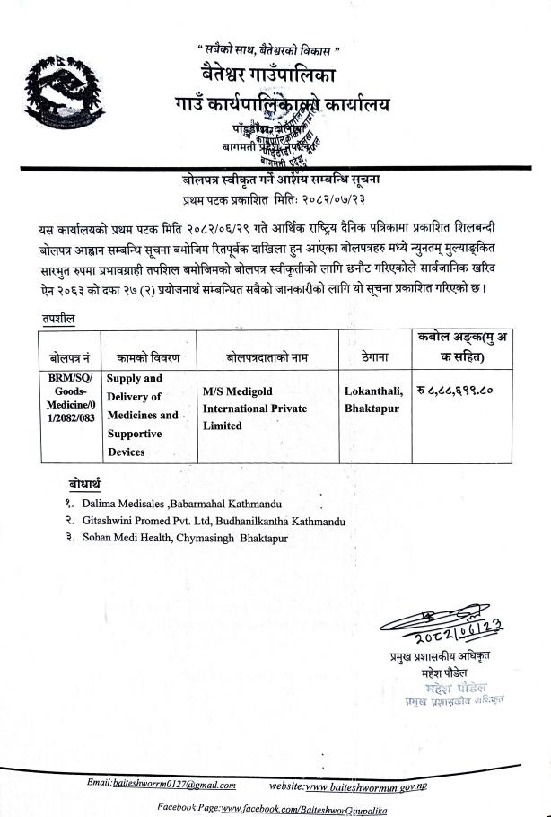 बोलपत्र स्वीकृत गर्ने आशय सम्बन्धी सूचना ।