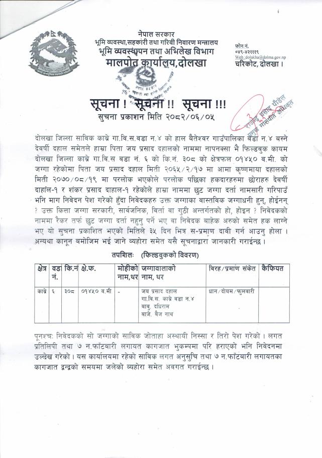 मालपोत कार्यालय, दोलखाबाट जारी जग्गा दर्ता सम्बन्धीको ३५ दिने सार्वजनिक सूचना ।