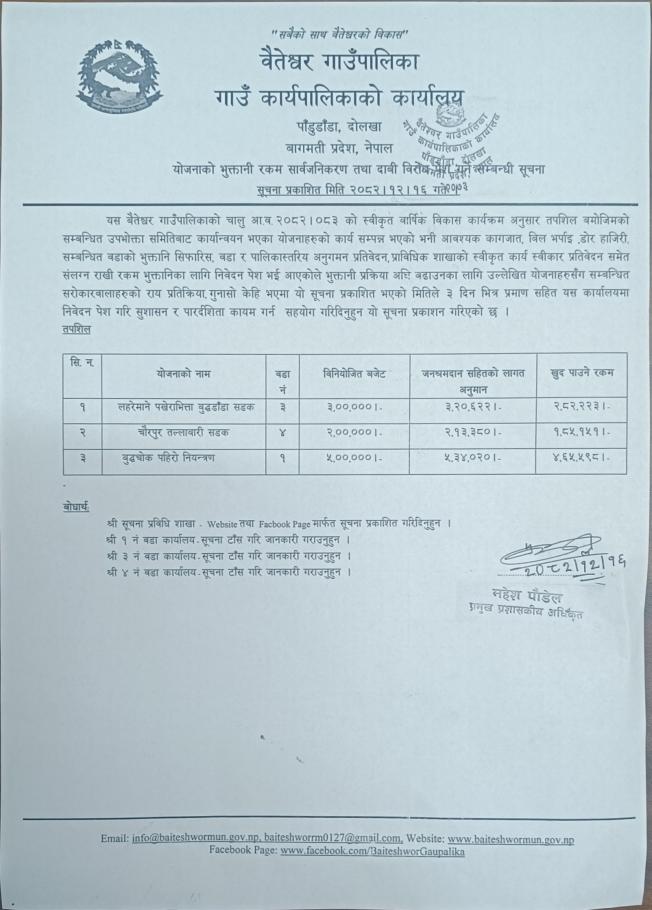 योजनाको भुक्तानी रकम सार्वजनिकरण तथा दाबी विरोध पेश गर्ने सम्बन्धी सूचना ।