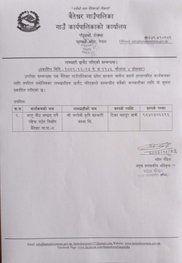 लाभग्राही छनौट गरिएको सम्बन्धी सूचना ।