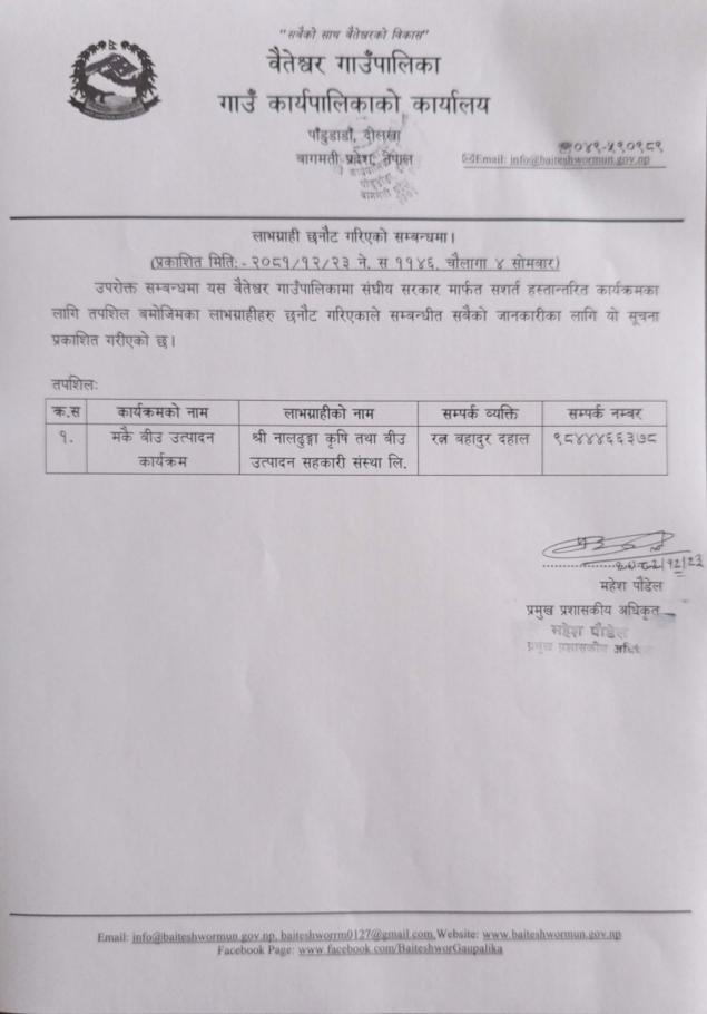 » लाभग्राही छनौट गरिएको सम्बन्धी सूचना ।