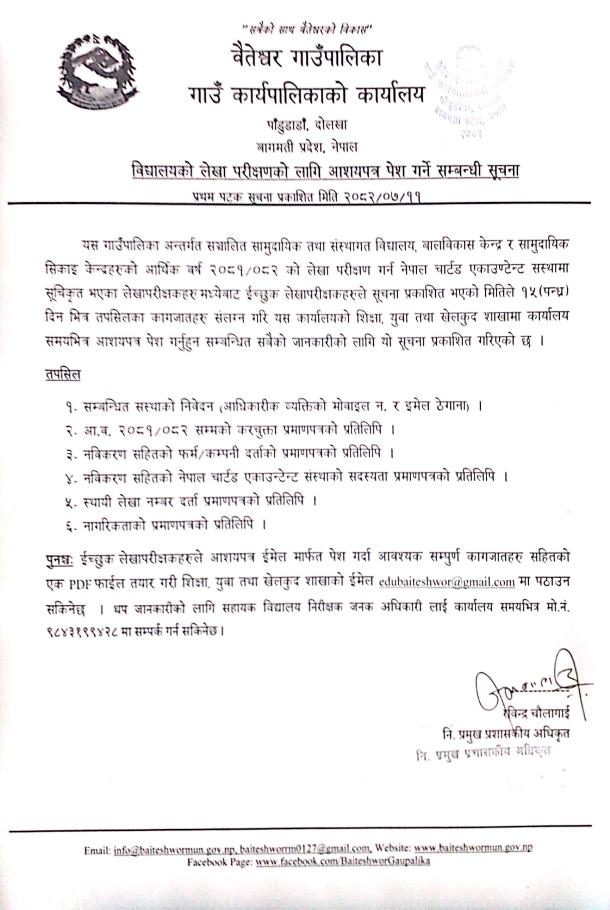 विद्यालयको लेखापरीक्षणको लागि आशयपत्र पेश गर्ने सम्बन्धी सूचना ।