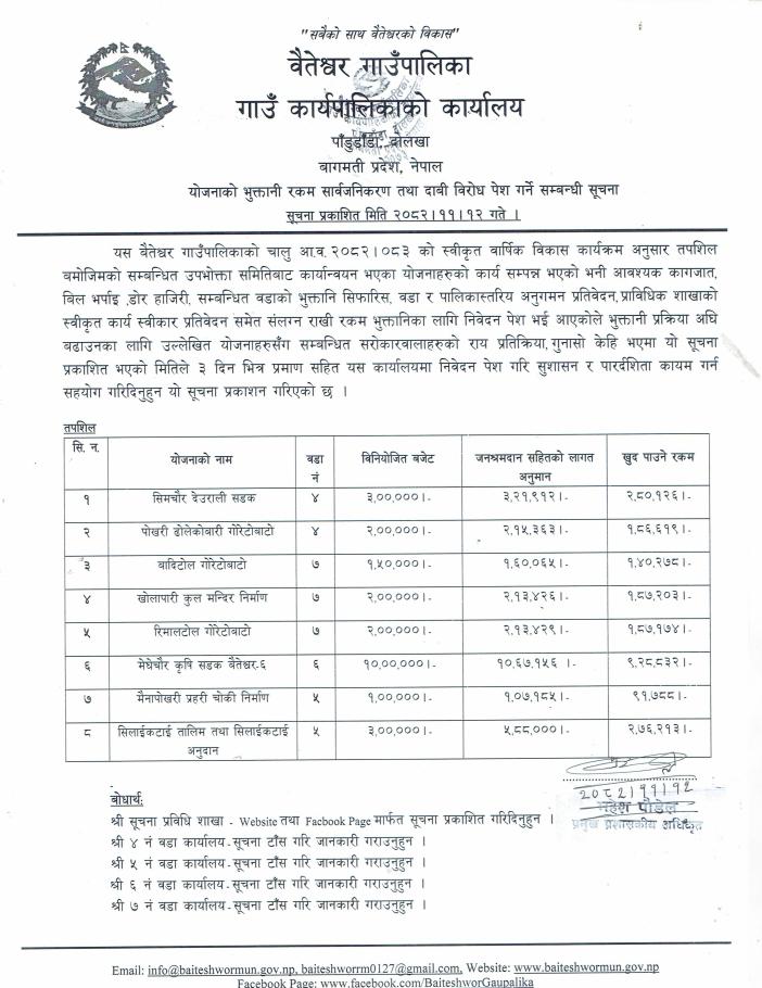 योजनाको भुक्तानी रकम सार्वजनिकरण तथा दाबी विरोध पेश गर्ने सम्बन्धी सूचना ।