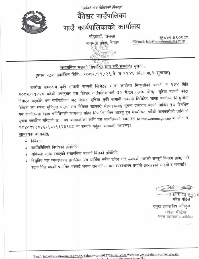 रासायनिक मलको सिफारिस माग गर्ने सम्बन्धि सूचना ।