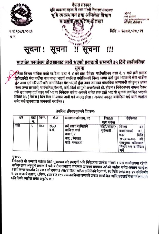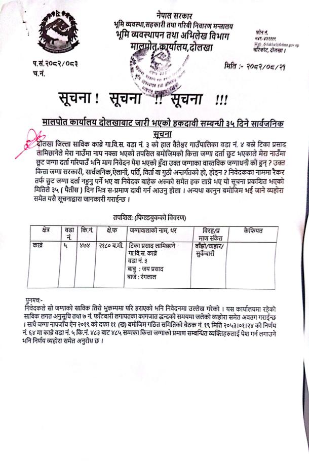 हकदावी सम्बन्धी ३५ दिने सार्वजनिक सूचना ।