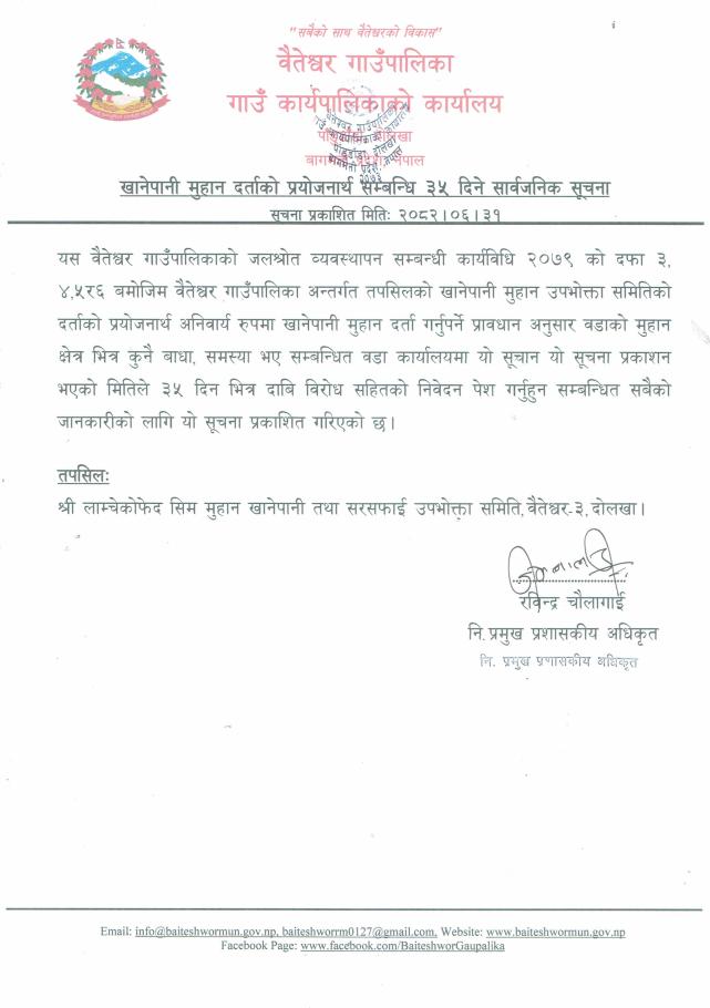 » खानेपानी मुहान दर्ताको प्रयोजनार्थ सम्बन्धि ३५ दिने सार्वजनिक सूचना ।